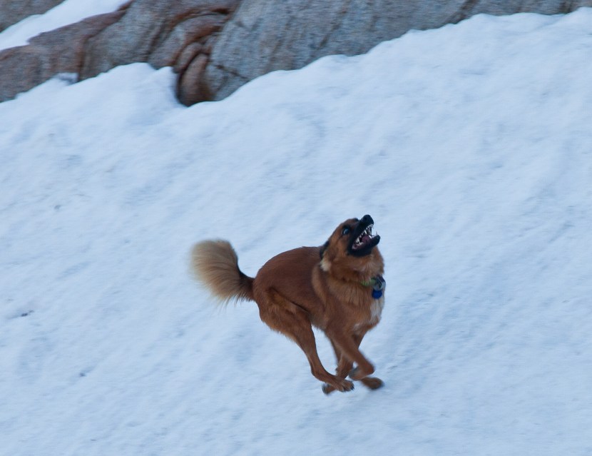 After the morning photography session, we began walking back towards camp. Suddenly, Callie became posessed and began sprinting around the area surrounding me, jumping off boulders, prancing through rivers and snow, and covering a ton of distance in the process. It was one of the most energetic and jubilant displays I’ve ever seen. I like to think that she was overcome with inspiration from such a beautiful Sierra sunrise, but more likely it was due to her being a dog.