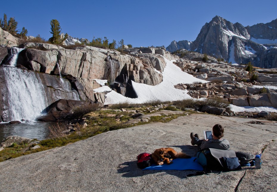 I moved across the valley on the southern side and managed a few tricky river crossings without having to put on river shoes. It was a slight pain to climb around, especially with Callie in tow, but after about 15 minutes we had arrived at Moonlight Falls. The location was just as beautiful as I’d hoped. I took a load off and began to relax and read. The Kindle has proven to be an indispensible luxury item on these trips, allowing me to have access to an entire library of books for only a few ounces.