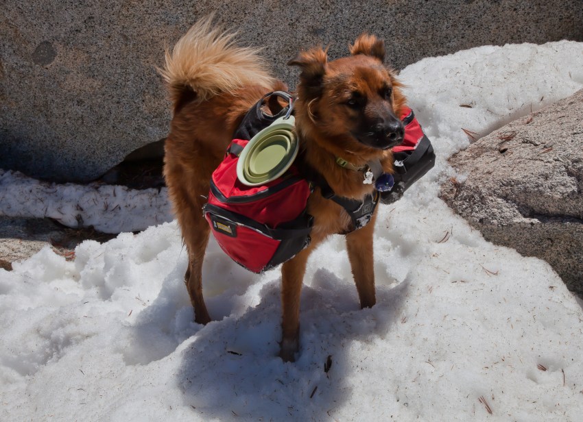 After moving up offtrail for a few minutes, I saw the trail again. It was down to our left, about 20 feet below us off a ledge. Doh! After canvassing the area a bit, we found a spot to clamber our way down to the trail. I tried to grab Callie to carry her over a big drop, but she averted my attempt and jumped off a 4 foot boulder, pack and all. I used a harsh tone to try to make her realize that big jumps were a bad idea with a pack on, but on the inside I was proud of my brave mountain dog.