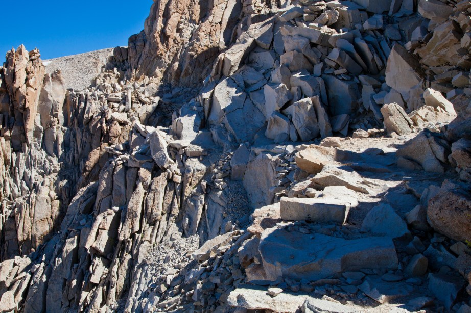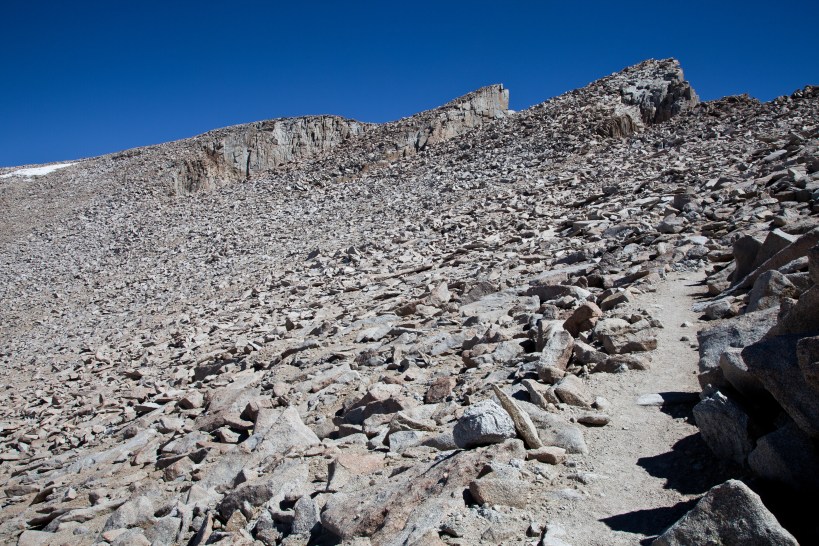 From trail crest, the trail drops down a few hundred feet before ascending the last thousand feet to the summit. The trail here is carved through talus and is a little unstable. There are numerous sections with pretty steep drops offs to the western side of the trail, and given that the slope goes down a few thousand feet, it feels a bit precarious. If you have trouble with exposed trails, this stretch might be a problem for you. Dave and I loved it though. After the boring section of switchbacks, this dramatic stretch of trail re-ignited our enthusiasm and helped us with the final push to the summit.