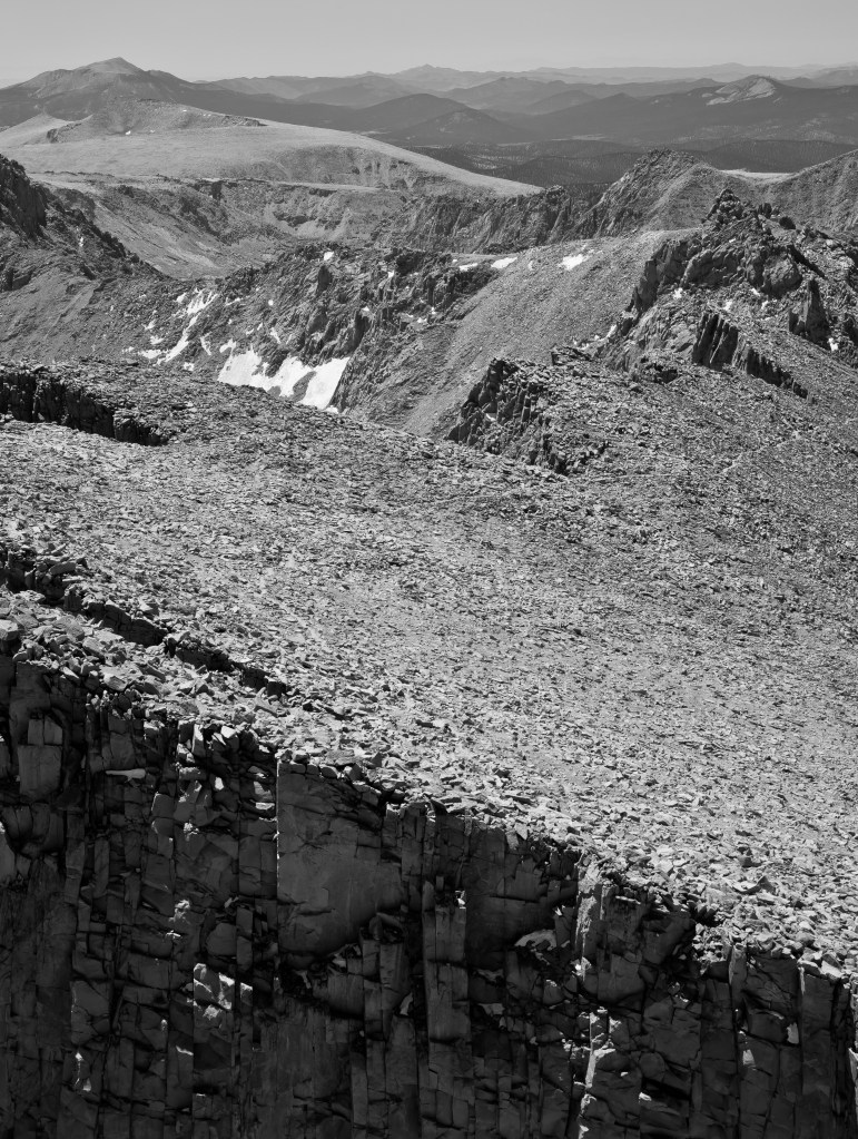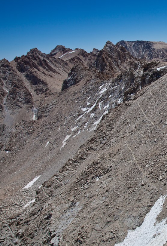 The view South at the start of the descent offers a few interesting perspectives. For one, there is what appears to be an endless line of ridges looking towards the Golden Trout Wilderness.