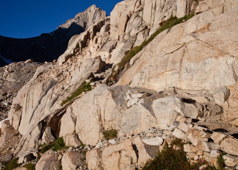 As night turned to day, things began to feel normal again and our pace slowed down to a more reasonable clip. This was a good thing though, as overexertion at high altitude can easily lead to AMS. We tried to keep a moderate but deliberate pace. Above outpost camp, the trail changes to primarily granite, and thus it becomes more rocky and uneven. At certain points it is carved straight out of rock walls.