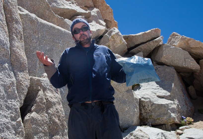 Starting at Trail Camp and up through the switchbacks, I began to notice numerous wag bags beside the trail. Since Mount Whitney is a heavily used area with limited soil, there is a regulation that all hikers take wag bags and carry out their waste instead of burying it which is the normal backcountry etiquette. Many hikers opt to leave their wag bags alongside the trail so that they can either pick it up on the return route, or leave it for someone else to deal with. I saw over a dozen of these in different locations and it definitely tarnished the wilderness experience. Please don’t Jersey the Sierra.