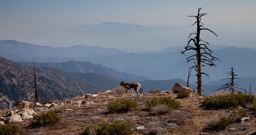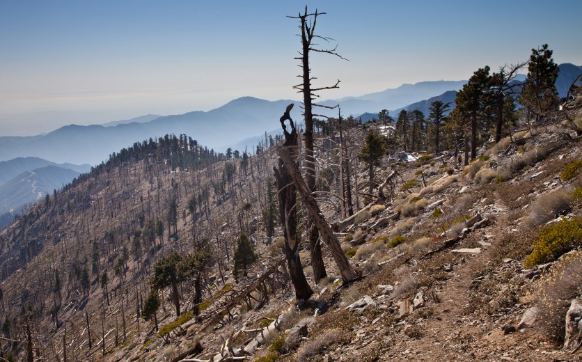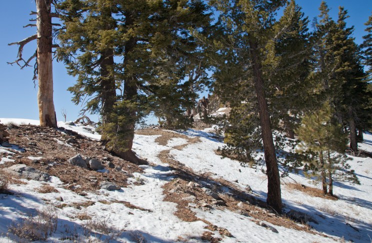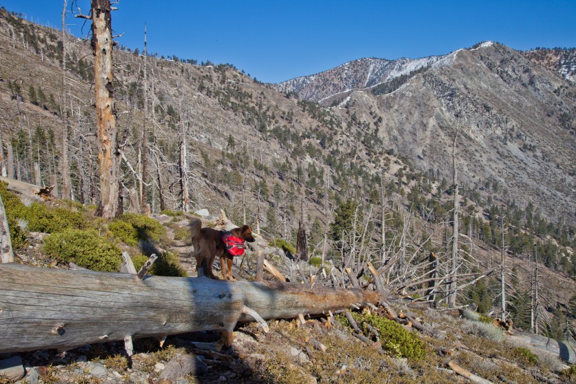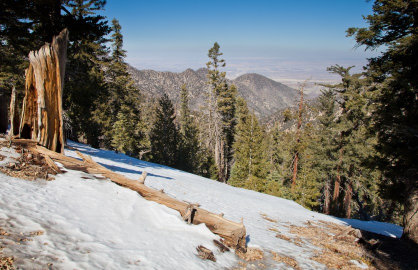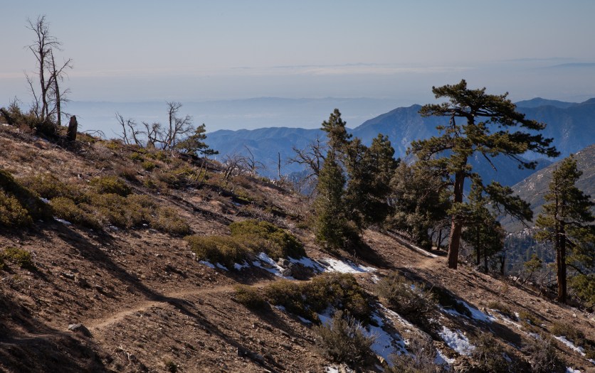 From here, we took the Islip Ridge trail West towards the summit of Mount Islip. The trail goes along the crest of the San Gabriel Mountains, darting back and forth between the North and South side. It starts out on the North side, which had intermittent snow and thankfully only a few burned trees.