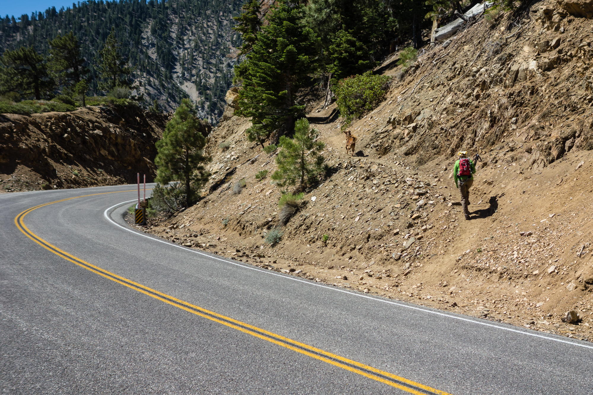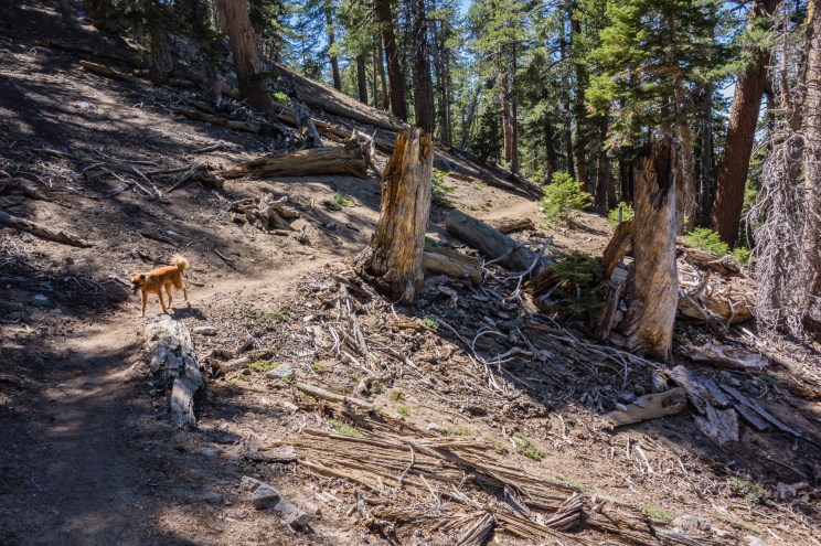 There are two trails that go up towards the PCT, but they both end up converging shortly up the hill. We have opted for the entrance on the left each time we’ve hiked the route. There is no sign posted to mark the trail, but it is easy to see as the highway rounds the bend on the saddle.