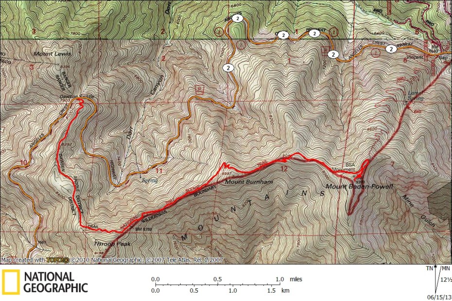 Eventually the trail deviates from the crest to circumnavigate Burnham on the northern side of the slope. The trail here is wooded and fairly flat, much like the Dawson Saddle stretch earlier. Like Throop, there is a side trail that allows for an easy detour to the summit of Burnham. The summits elevation is actually 8,997 feet, but it rounds up to 9,000 which is good enough for me.