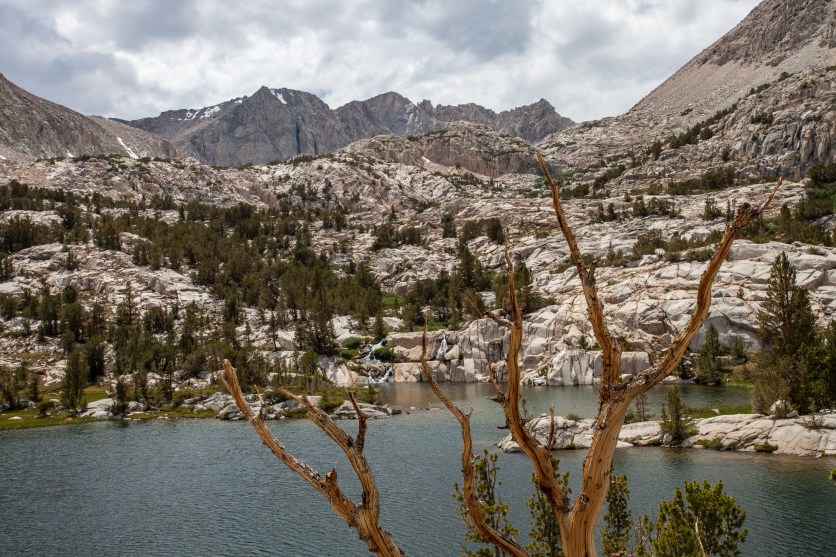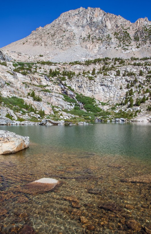 We did not make it to the highest lakes in the basin. Once we reached the fifth lake, we were so impressed that going any higher seemed pointless. The lake has yet another waterfall tumbling down into its western end, and the tall granite cliffs on each side make it the most dramatic of the Wonder Lakes we saw.