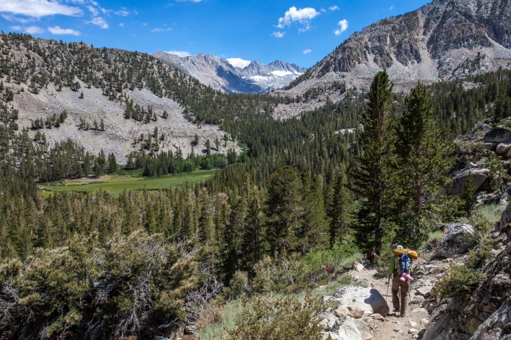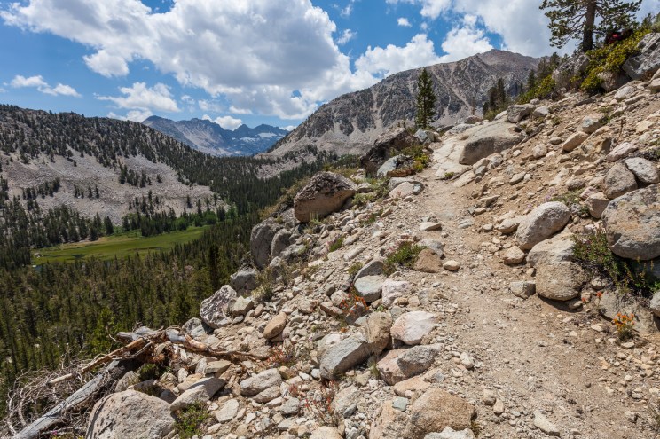 After about a mile, the trail reaches an intersection to Grass Lake. From here, the trail to the Lamarck Lakes becomes significantly steeper. The payoff for the aggressive ascent is a great view of the green meadow surrounding Grass Lake and a glimpse into the Sabrina Basin.