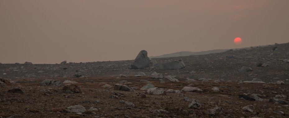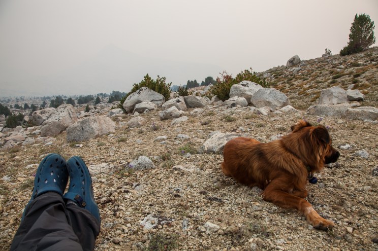 The smoke was so thick that Mount Humphreys and the Glacier Divide were completely obscured. Not only was photography pointless, but even trying to go around and find compositions to shoot during better conditions was a futile activity. Even basic orienteering was difficult in such smoky conditions, so there wasn’t much choice other than to just hang out by the camp. While I read, Callie kept a very close eye on a nearby encampment of marmots. This was my view for the next few hours.