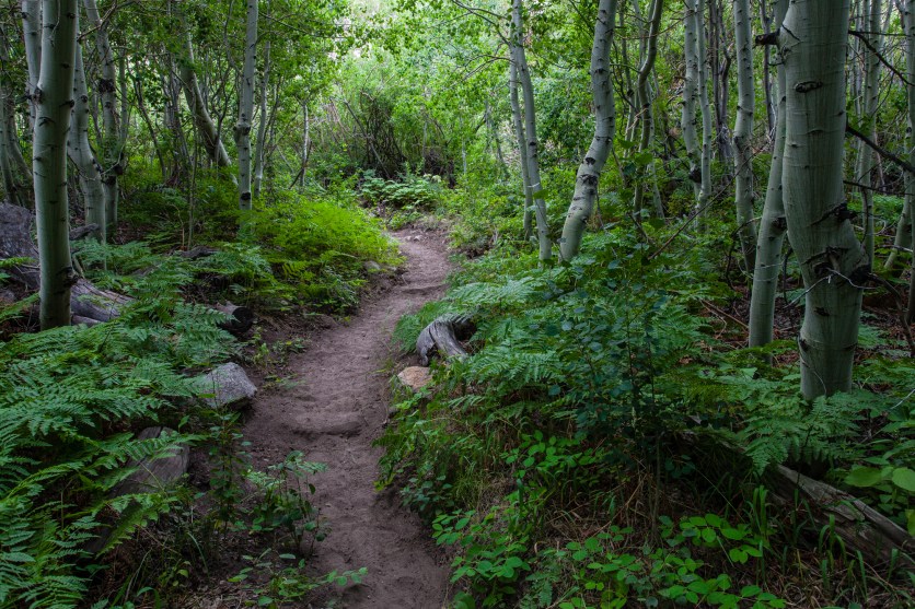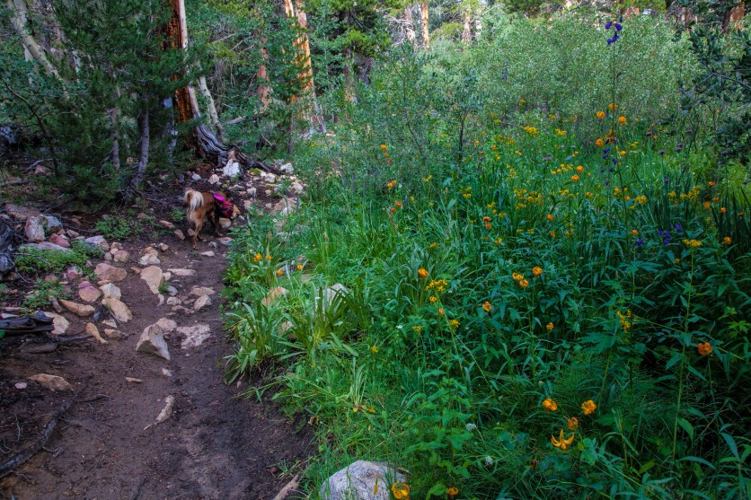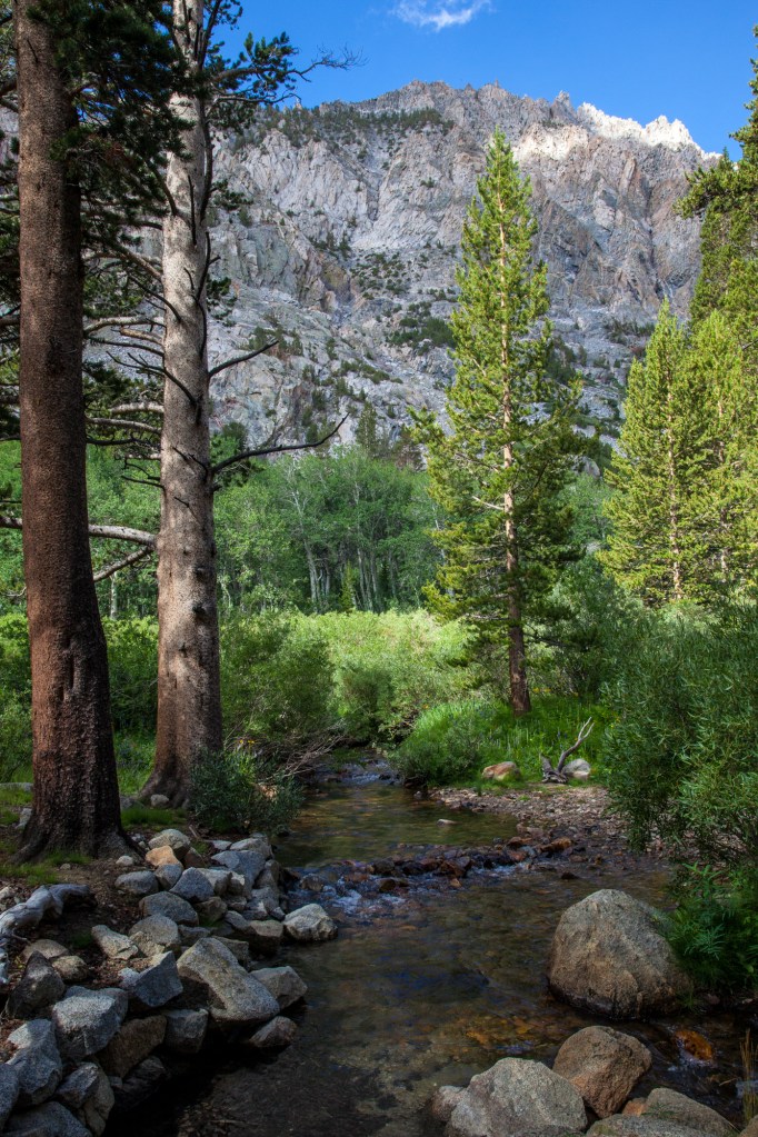The first part of the trail moves along the North Fork of Bishop Creek. The rushing water, frequent wildflower displays (if you time it right), and occasional open mountain views make it a stunning stretch of hiking through the woods.