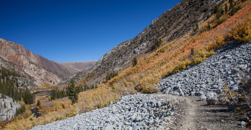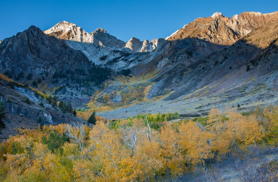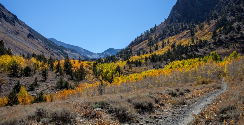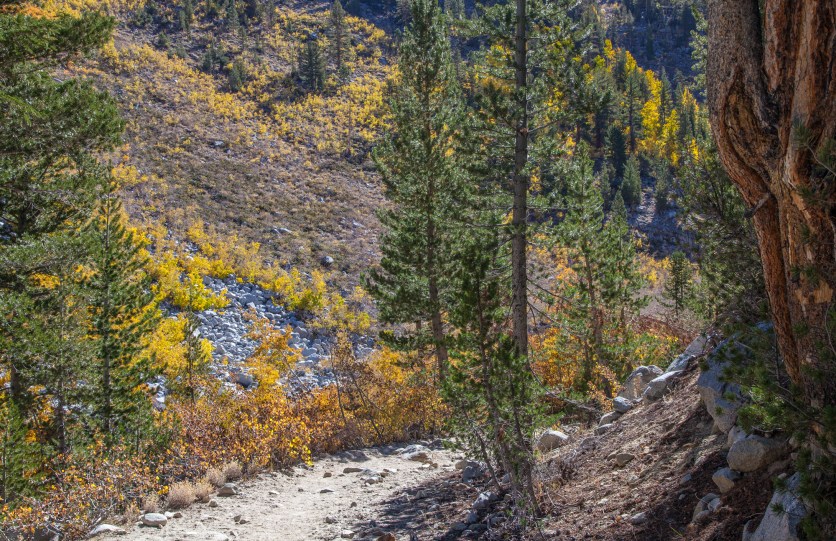 As the trail goes up the canyon, the groves along Mcgee Creek and on the ridge below Mount Baldwin create a beautiful stripe that winds up the mountain, and we were fortunate to hit this area close to its peak fall color.