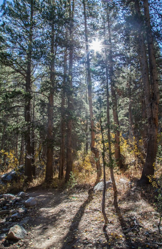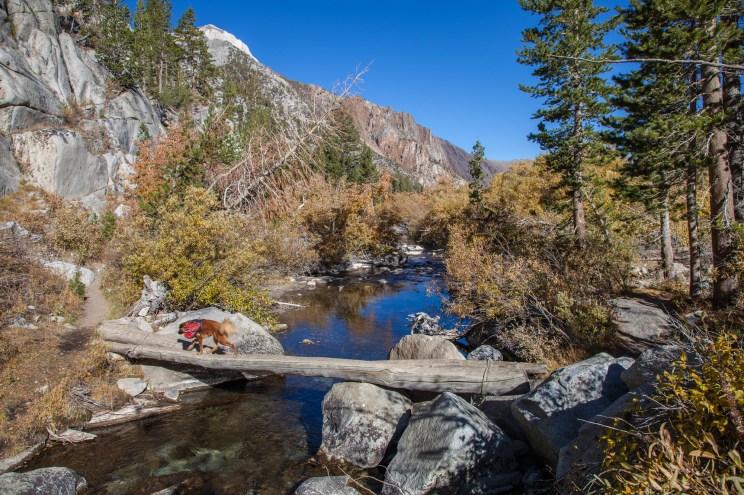 If you are just hiking for fall color, then there isn’t much need to cross the river. The trail begins to ascend more rapidly through a dense forest with only a smattering of color to be found. This trail accesses a number of lakes on the east side of the pass, as well as a whole region of dog friendly backcountry over the west side of Mcgee Pass. For this trip, we were focused on fall color so we began to head back down the trail before reaching any of the lakes.