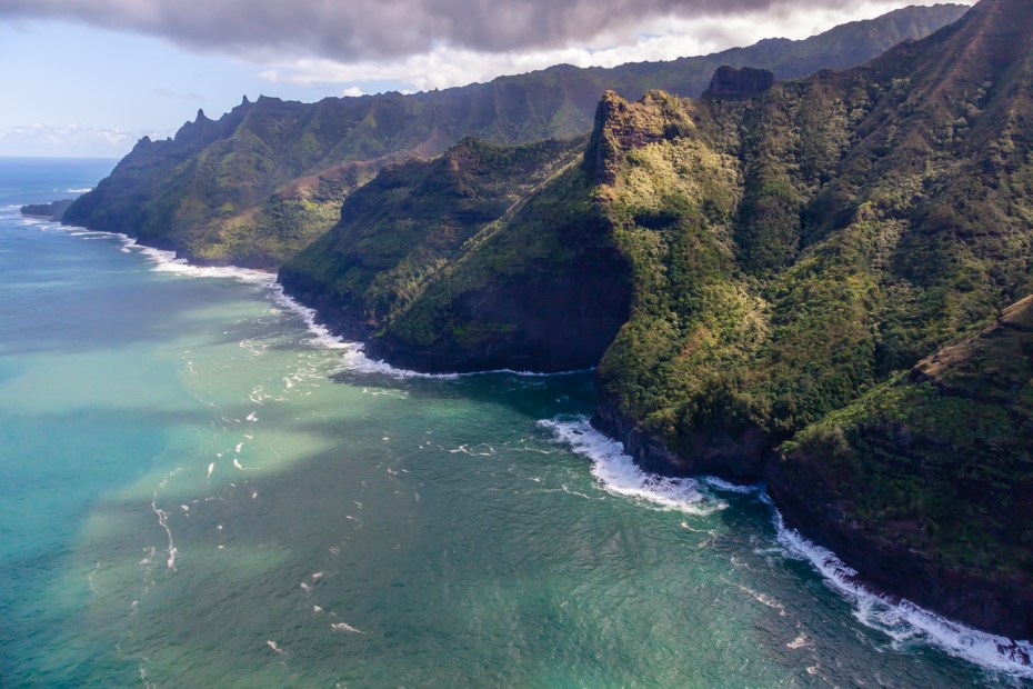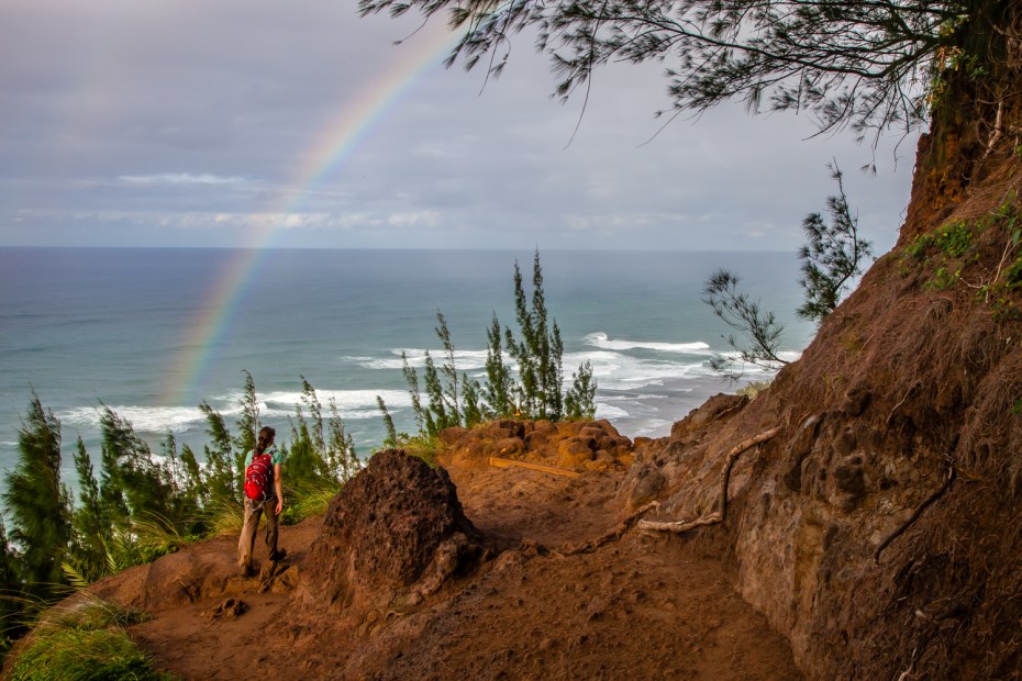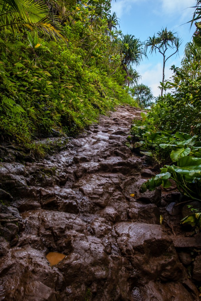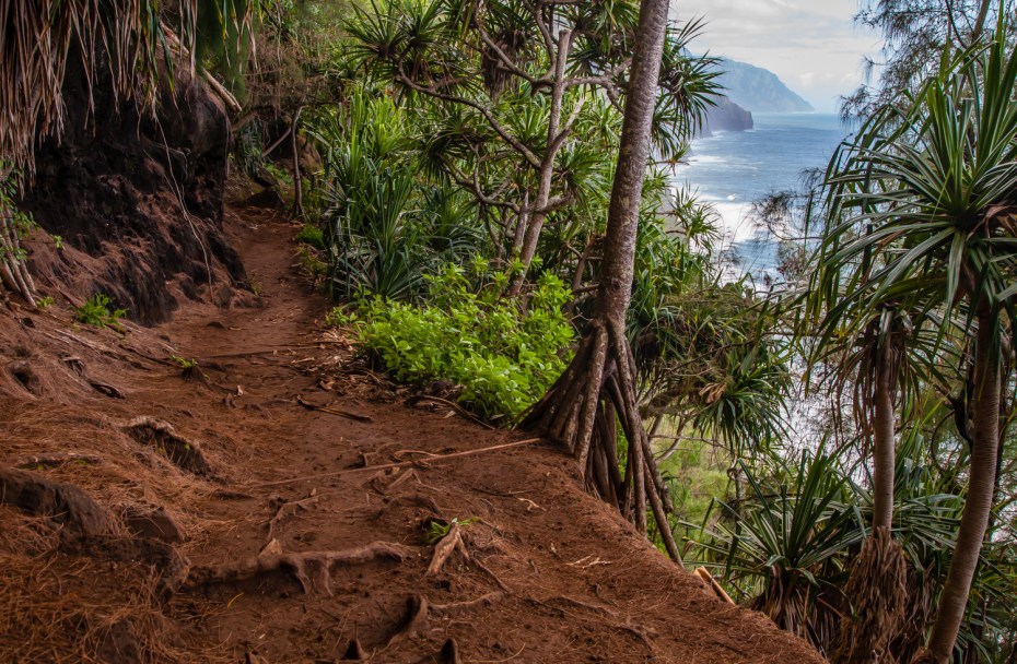 The trail starts at Kee Beach at the end of the road on Kauai’s north shore, and for the first mile it ascends up about 400 feet over a steady, moderate slope. Conditions here are often pretty muddy, which can make some of the steeper sections a bit precarious.