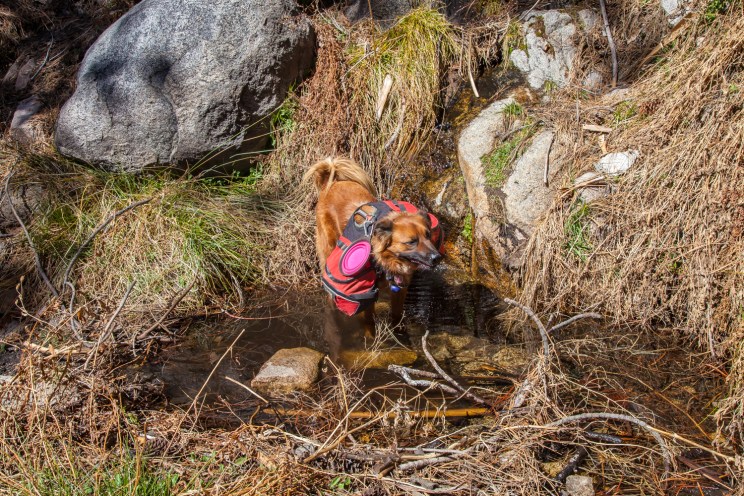 On this stretch, we ran into the only water source for the hike. The small trickle provided the perfect rest break for Callie but didn’t look like an appetizing source for humans.