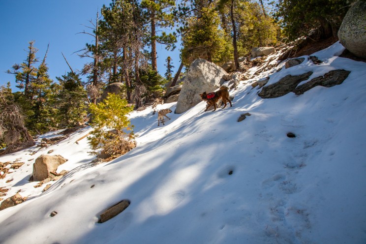 At the saddle, Callie and I ran into another hiker and his dog. Russell, the 7 month old lab, was a worthy match for Callie’s energy on the trail and in the snow, and with that common ground established, they were friendly with each other immediately. We decided to join up and see if we could tackle the snowy slope leading to the Twin Peaks despite not having brought any traction for our boots. I silently lamented about leaving all of my snow gear at home. I could have easily just made Callie carry it!