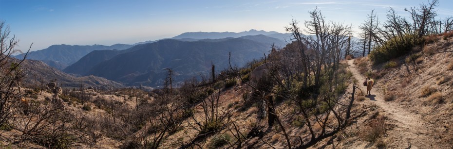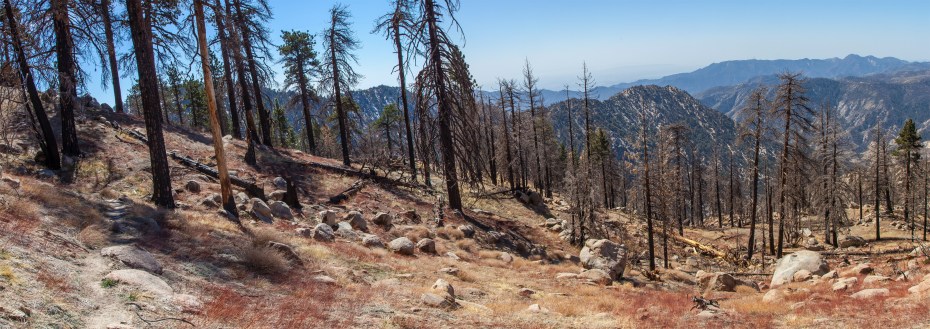 Walking along surrounded by miles of scorched earth, with large charred trees still flanking the trail, the devastation of the Station Fire feels palpable up here.
