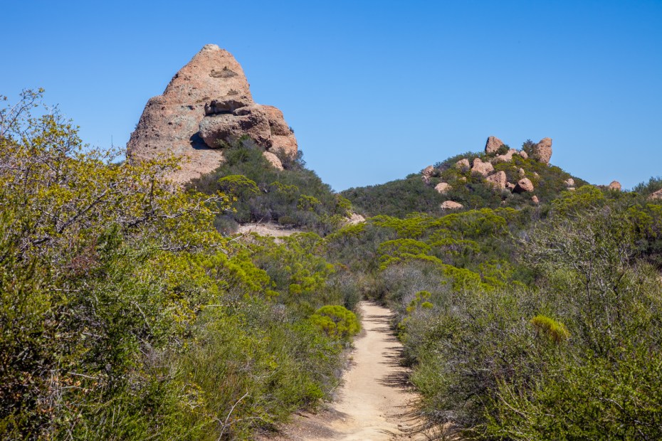 As you approach the junction to the Backbone Trail, the landscape flattens out as you reach a plateau on the top of the Santa Monica crest. Distant landmarks are blocked in each direction, and your view is relegated to blue skies, green shrubs, and the occasional tan sandstone cliff.