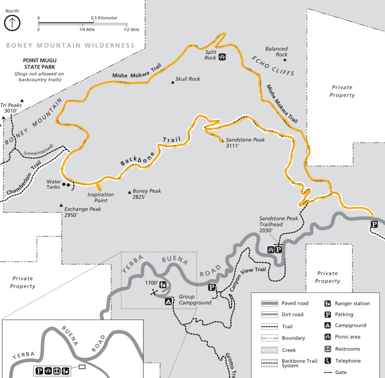 Fortunately for dog owners, Sandstone Peak is accessible via two different dog friendly trails that can be combined into a six mile loop. There are two trailheads that result in almost the same exact distance for the hike, so it doesn’t matter which one you take. In our case, we normally choose the Yerba Buena trailhead since we are coming from the 101 and its the first we run across. In either case you’ll be hiking for about a half mile from the trailhead to a junction where you access the loop.