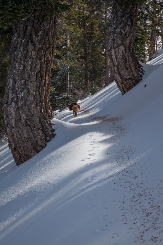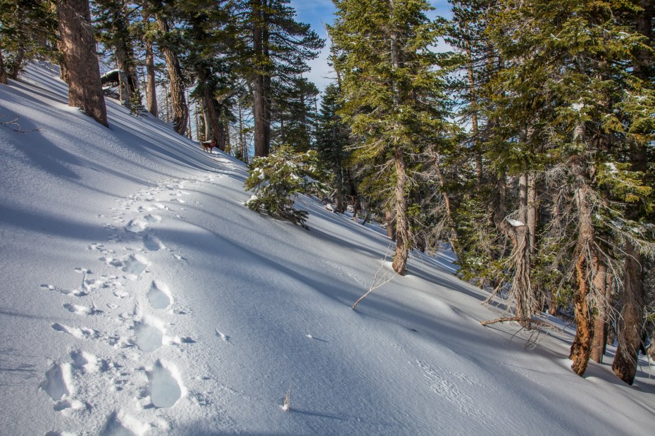 Then, a quarter of a mile into the traverse, the footprints stopped at a particularly steep section of trail and turned around. As I began to head across the steep slope with barely any trace of trail, a sense of doubt washed over me for a moment. Did the person that turned around know something that I don’t? Was I getting in over my head? At this point, we still hadn’t seen another person on the entire hike, and the wilderness out here is surprisingly vast and rugged. It’s not a good place to make a mistake. This is a recurring theme with our snow hikes, but it’s an important one to emphasize.