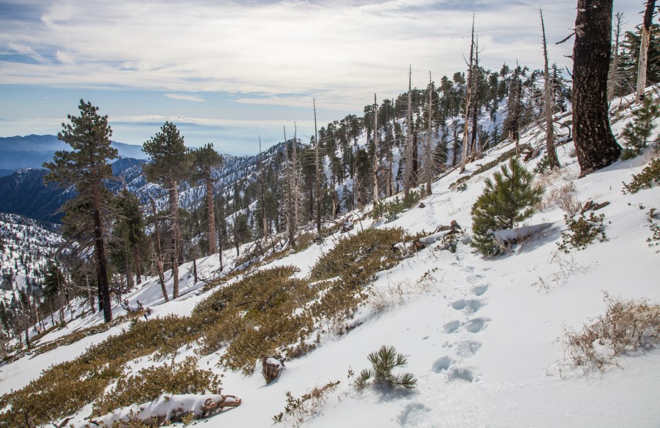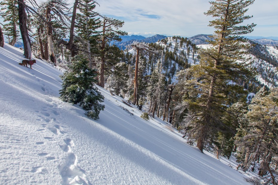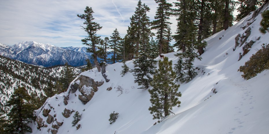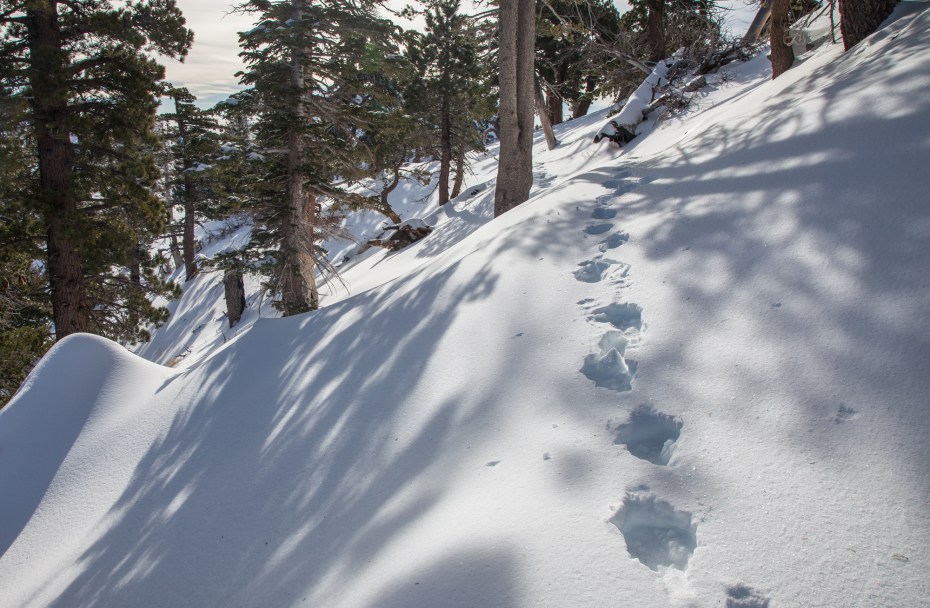 After a couple of steep sections, the trail mellows out substantially and we felt well rewarded for our efforts. This is a beautiful stretch of trail, especially after a recent snowstorm when Mount Baldy and the Sheep Mountain Wilderness have a dusting of snow. Walking through this pristine snow covered wilderness without any sound other than my feet crunching through the snow was one of the most peaceful moments that I’ve experienced on the trail.