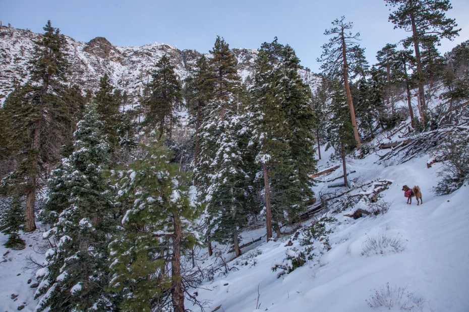 In the dawn light of a crystal clear Sunday morning, Callie and I drove into the Crystal Lake campground to find an empty parking lot at the trailhead. Even though our arrival was fairly early, this was a bit of a surprise given the recent snowfall that had blanketed the area. Snow in the San Gabriel mountains is not an unusual occurrence, but it usually does not linger on the front slopes for more than a few days, so it’s important to take advantage of the short windows of opportunity that open up each winter.