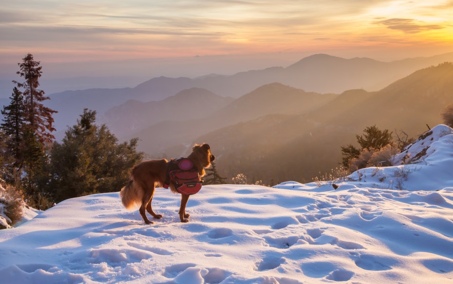 As the day drew near a close, we had one last moment of bliss as clouds over the mountains and ocean burst into color from the sunset. Callie found herself on a section of snow getting basked in the golden light just as the sun was dipping out of sight. The contrast of the ocean and snow mixed with the dramatic sky gave the scene an incredibly surreal feeling. This is what dog heaven must be like, at least for Callie.