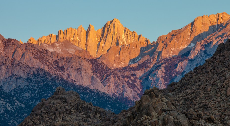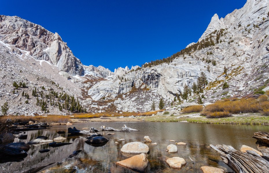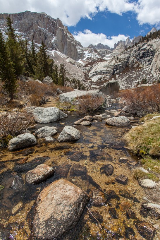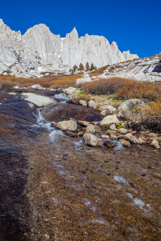 This trip started in the Alabama Hills, with a typically crystal clear sunrise view of Mount Whitney catching the first light of the day. The Alabama Hills are the perfect staging point for a backpacking trip in the Sierra, and I have started many weekends with this incredible view of the Sierra crest. On this particular day, I had the distinct satisfaction in knowing that I was about to climb the mountain that I was staring down.