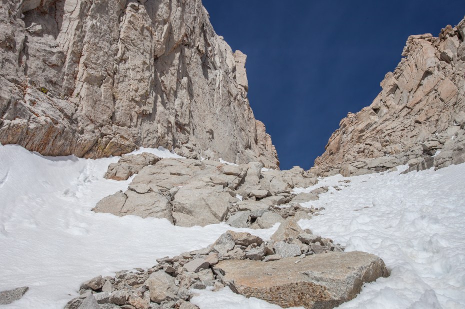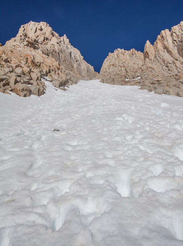 The more significant change was the overall softness in the snow. Having soaked in a few extra hours of the hot summer sun, the deep snowfield covering the chute was now soft slush, and most steps had me either slipping down the slope, or postholing down to my knees. Crampons are basically useless when the snow gets this soft. A couple of times, I had one leg slip while the other one sank deep into the snow, which forced my lower body into some uncomfortable positions. Once we reached the bottom, I felt elated that I avoided any major injuries.