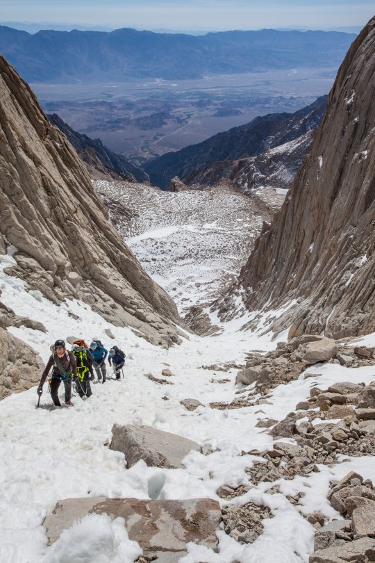 The final 400 is steep enough to be treacherous anytime of year, but it is not technical enough in most conditions to necessitate the use of ropes and anchors. In our case, the snow on the slope was soft enough that the ropes felt more like an additional insurance policy instead of required gear. In either case, I was glad to have them, just as I was happy to be climbing behind an experienced climber like our guide Ryan Huetter, whose calm demeanor vanquished any uneasiness I might have normally had.