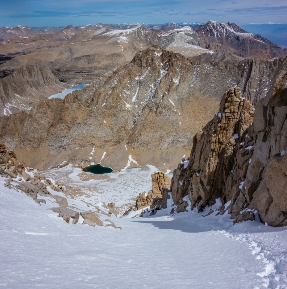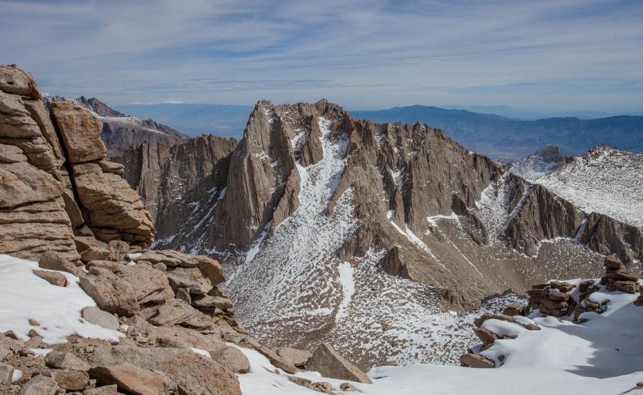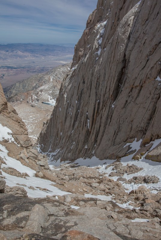 At the top of the chute, there is a small plateau where we had the opportunity to take a break and prepare for the final 400 feet to the summit. There is a great view of Mount Russell to the north, with Owens Valley peeking from behind. The view and a small break left me feeling a little bit better, but I still was nervous about what laid ahead.