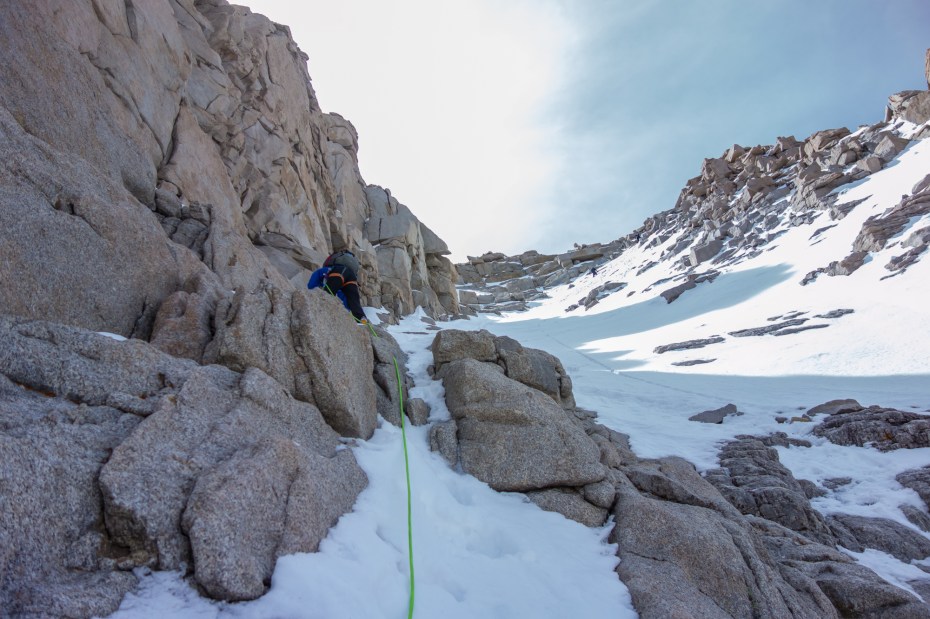 There are a few different chutes that people use to ascend the final 400 feet of the mountaineer’s route in the summer months, but when winter conditions prevail, the first chute is the only logical choice. We roped up and allowed our guide Ryan to hike up the first pitch, without having seen what we were about to throw ourselves into. Once Ryan let us know that he had set up an anchor and we were on belay, we turned the corner and saw what the final stretch of the climb entailed.