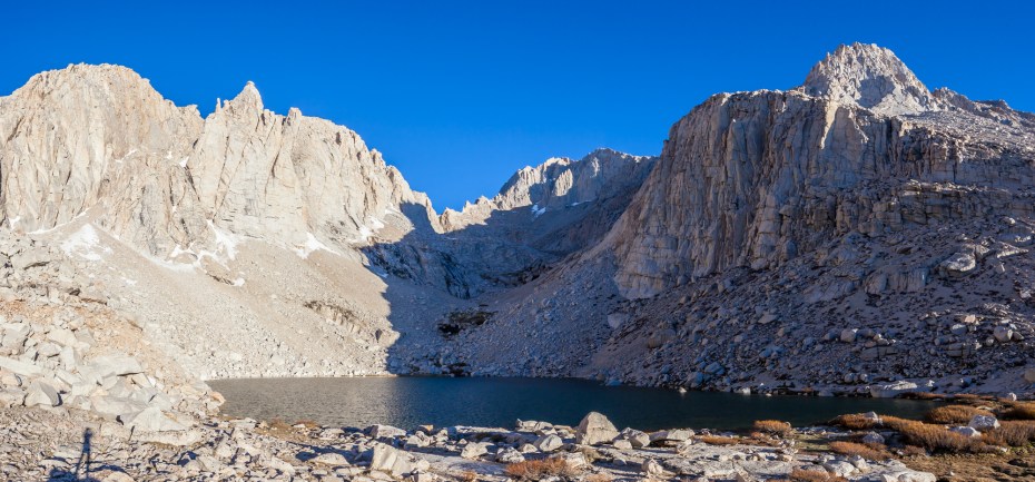 After the ledges, the trail returns to its normal state, and promptly reaches Lower Boy Scout Lake. The summit of Mount Whitney occasionally pokes its head above the ridge line, but open views of the mountain are non-existent until the moraines above Upper Boy Scout Lake. Soak it in while you can.