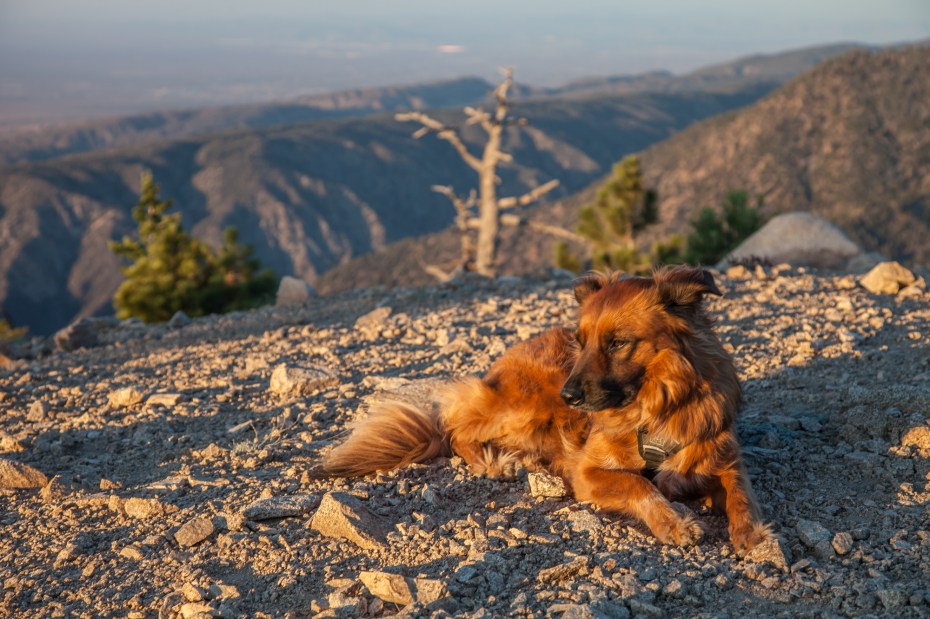 I decided to go a bit gourmet for this occasion, and lugged up a chair, some wine, and a delicious spread of fresh food.  The idea of having a fancy doggie date with a sunset view of the desert seemed just preposterous enough to be worth doing. Besides, the extra weight could easily be justified as backpacking training, the peak was empty which meant that we could enjoy our unusual behavior without getting double takes from socal peak baggers, and life is too short to not linger on top of a mountain every once in awhile.